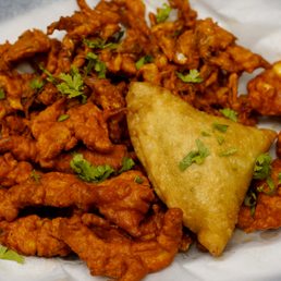 Mix vegetable pakora, chicken pakora, shrimp pakora, and one-piece vegetable samosa. Samosa cannot be made gluten free.
