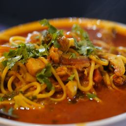 Five pieces of chicken Momo (dumpling) served in spicy sesame and tomato-based warm and comforting soup. Please give extra time for preparation. It contains gluten and can't be made gluten free.